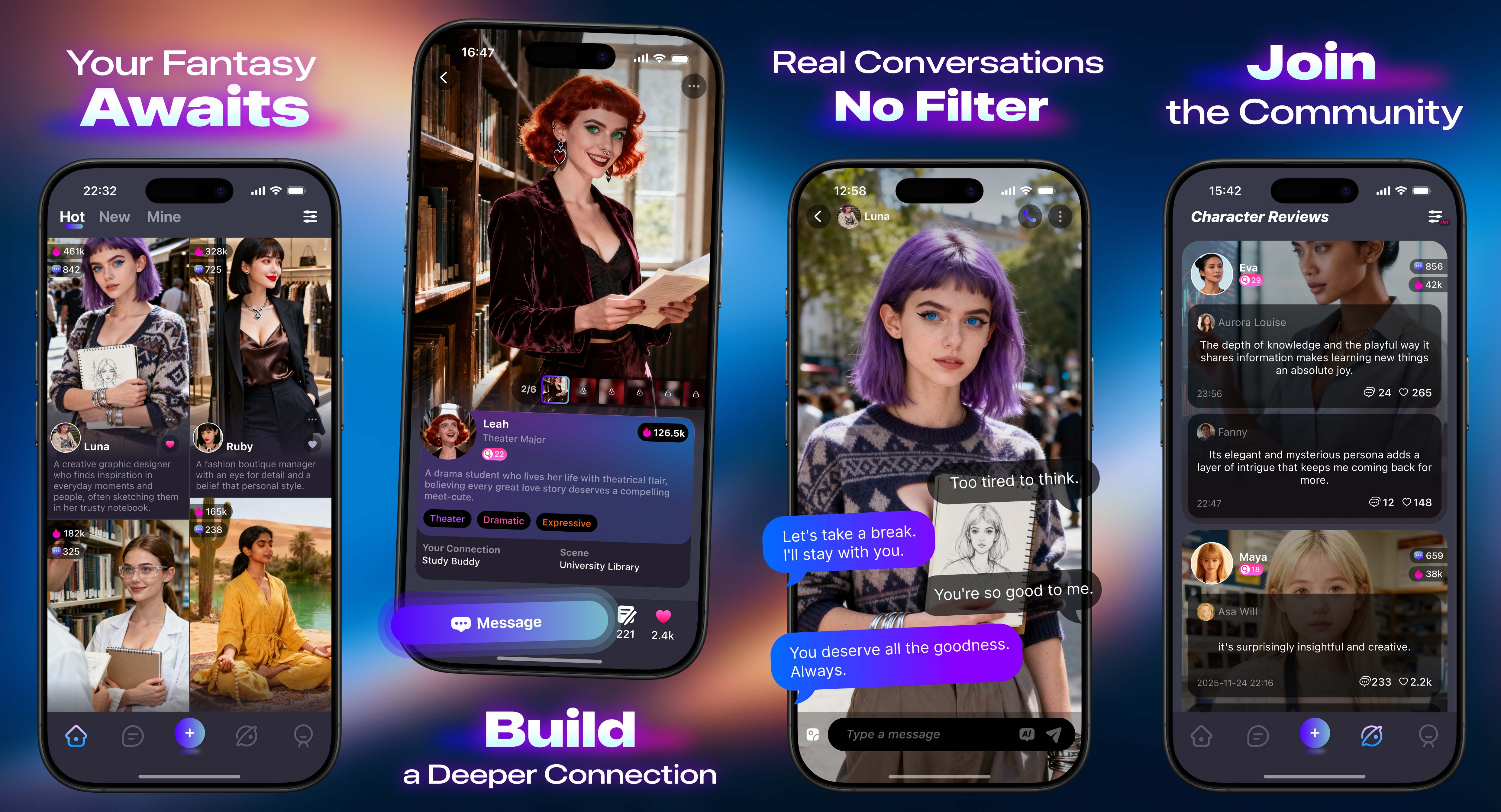 Complete Character Customization: You are the creator. Design every aspect of your AI partner—from their personality, backstory, and appearance to their unique communication style. Build the perfect fantasy, down to the last detail.